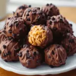Köstliche kleine Bällchen aus Erdnussbutter und Rice Krispies, umhüllt von schmelzender Schokolade – perfekt als Snack oder Dessert.