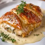 Hühnchen Wellington mit Dijon-Cremesauce auf einem Teller serviert