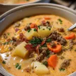 Eine herzhafte Hamburger Kartoffelsuppe, die mit saftigem Rindfleisch und frischem Gemüse gefüllt ist.
