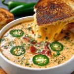 A rich and creamy soup that combines the spicy warmth of jalapeños with the delightful texture of cream cheese and cheddar, served with crispy grilled cheese dip.
