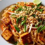 Ein köstliches veganes Tofu Pad Thai mit einer perfekten Balance von süßen, salzigen, sauren und scharfen Aromen.